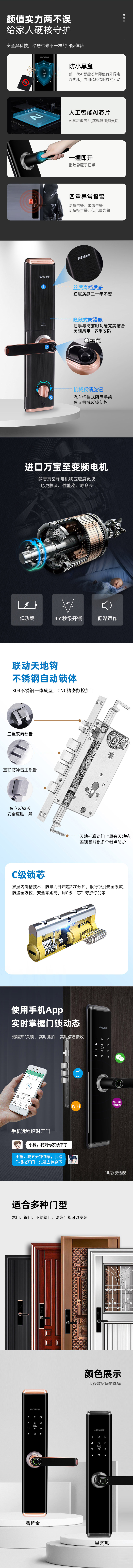 1、外觀簡(jiǎn)約時(shí)尚,線條優(yōu)美動(dòng)感,設(shè)計(jì)層次豐富,IML觸摸屏設(shè)計(jì)耐久如新,人機(jī)工程學(xué)一握開把手設(shè)計(jì),使用舒適,符合時(shí)代潮流雙軸套游離把手有效防松動(dòng),萬寶至電機(jī),快速秒開門,,多種開鎖方式,可手機(jī)遠(yuǎn)程操控, 科技感十足;
